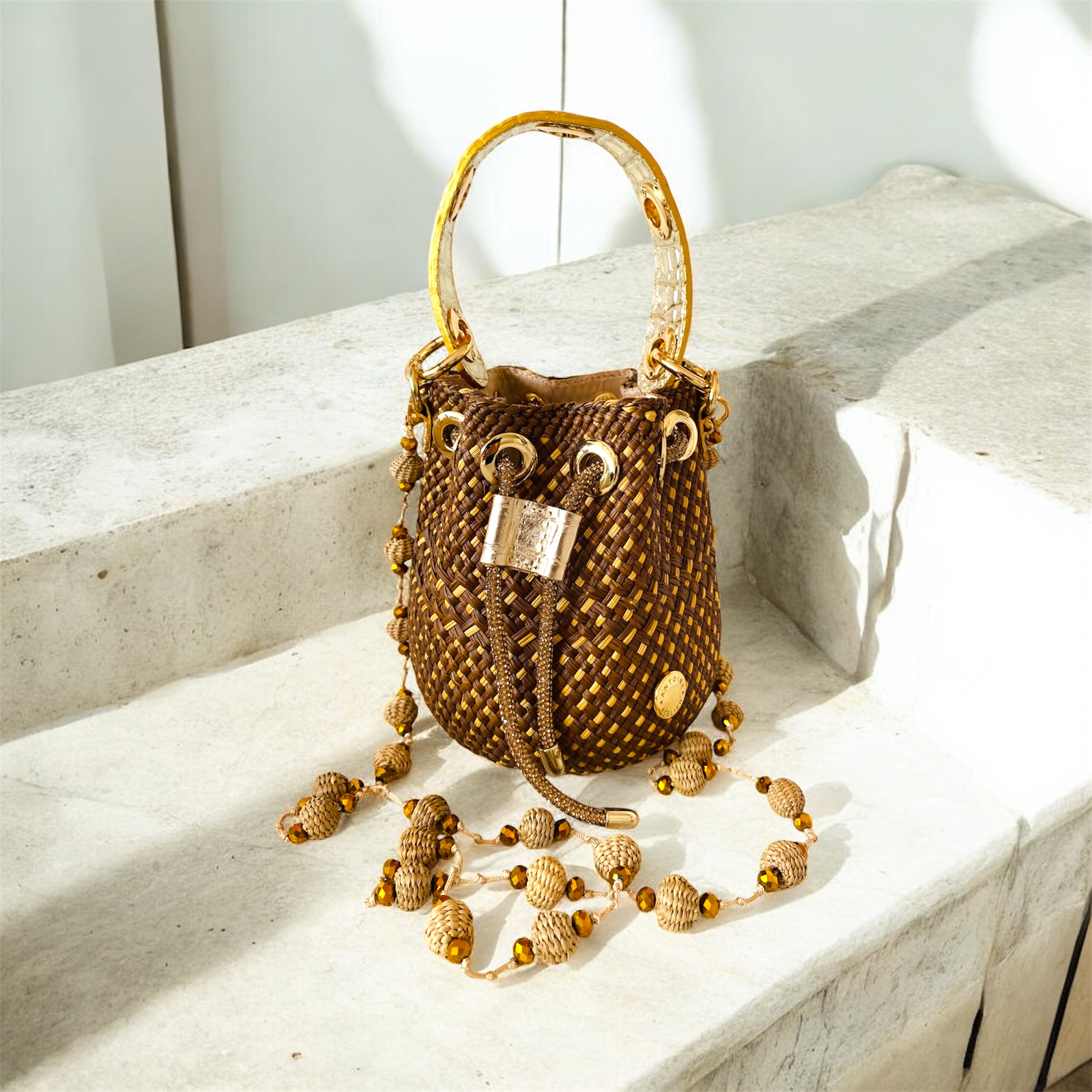 Woven bag in natural vegetable fibers, color black and white, measures 20×16 Golden crystals strap.