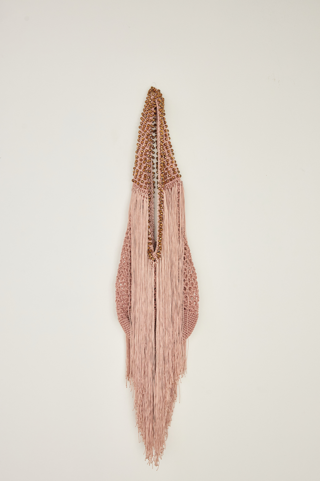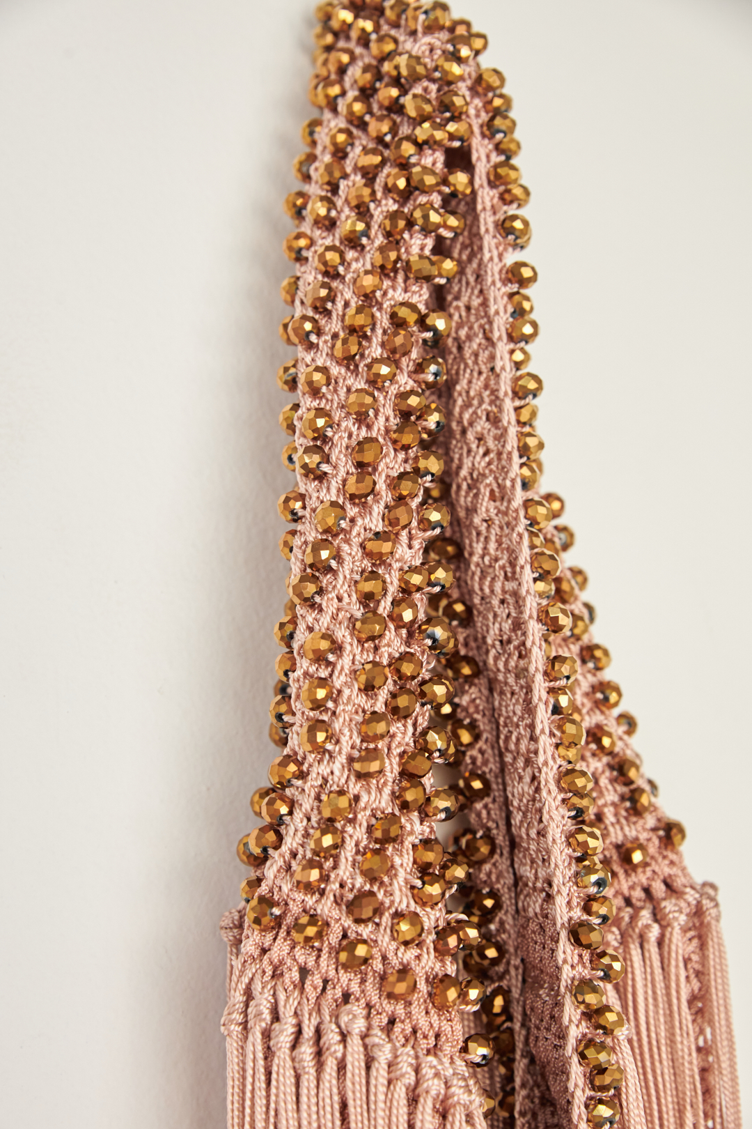 Woven bag, handmade in textile fibers – color: Pink, embroidery with brown crystals. Measurements: 50×25. Price in US Dollar.